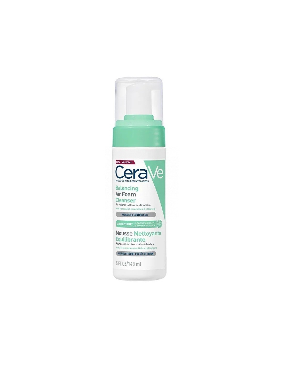 El limpiador air foam reequilibrante de cerave, con 3 ceramidas esenciales y tecnología glycolysine, limpia de forma potente pero respetuosa, reequilibrando la piel y eliminando el exceso de sebo, suciedad, maquillaje e impurezas, al tiempo que mantiene la hidratación. Proporciona 24h de hidratación* y 8h oil control** para una barrera cutánea con un aspecto más saludable. Esta espuma facial limpiadora es suave y apta para todo tipo de pieles, incluidas las pieles sensibles. No contiene perfume, es no comedogénico e hipoalergénico. Reequilibra la piel mixta, aportando 8h de oil control* y 24h de hidratación** para una barrera cutánea con un aspecto más saludable. Espuma no comedogénica para una limpieza agradable y sin fricción. 8h oil control* 24h hidratación** 91% notan su piel sin sensación grasa 24h tras la limpieza*** 97% coincide en que el producto elimina eficazmente exceso de sebo, suciedad e impurezas*** *test instrumental después de 8 horas, 30 sujetos **test instrumental después de 24 horas, 27 sujetos. ***estudio 4 semanas, 78 sujetos con piel mixta. *test instrumental después de 24 horas, 27 sujetos. ** test instrumental después de 8 horas, 30 sujetos