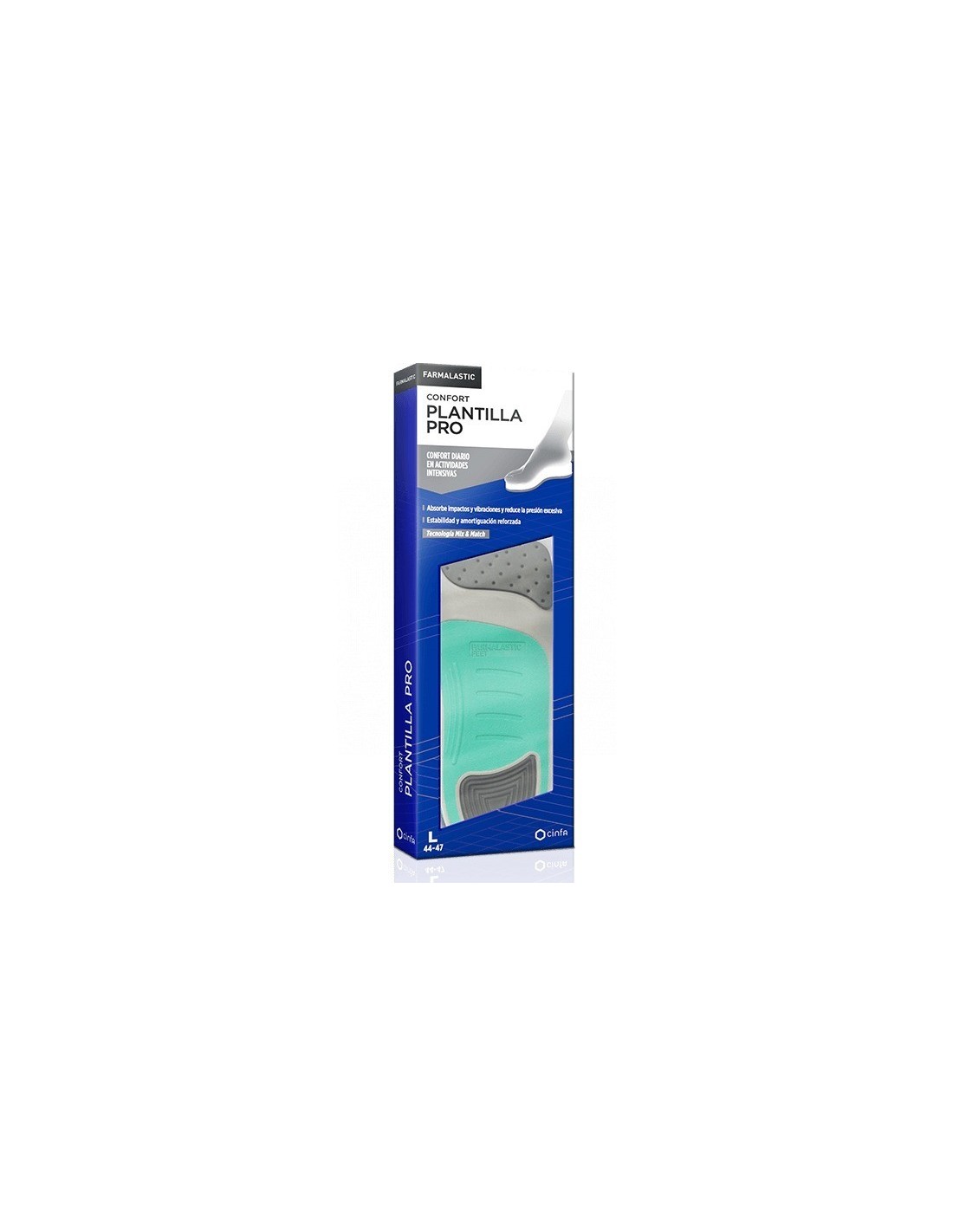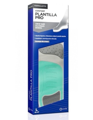 Las plantillas PRO de Farmalastic están desarrolladas en Tecnología Mix and Match con PU (Poliuretano) y Doble Gel TPE (Thermoplastic Elastomer) que ayuda a absorber los impactos y vibraciones de forma eficaz y a reducir la presión excesiva que los pies soportan en actividades intensivas. Ayudan a proporcionar de forma reforzada mayor estabilidad y soporte en el arco plantar y amortiguación en metatarso y talón. Su sistema de tallaje y ajuste permiten una adecuada adaptación anatómica de cada talla al número de calzado. Pueden utilizarse con el calzado habitual, deportivo o de trabajo.
