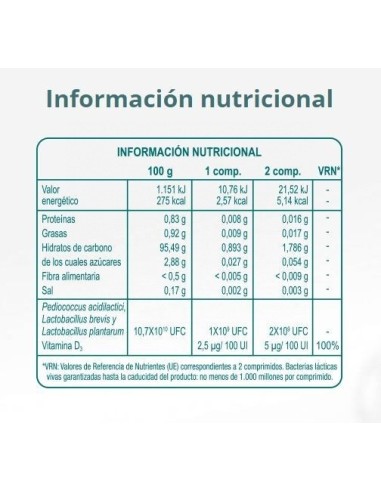 LactofloraSorbitol E420, Lactobacillus brevis CECT 7480 y Lactobacillus plantarum CECT 7481, Goma guar E412, aroma, dióxido de silicio E551, estearato de magnesio E470b, Colecalciferol (Vitamina D). ANÁLISIS MEDIO Por 100 g: Proteínas: 1,30 g Hidratos de carbono: 86,71 g - azúcares: 1,43 g Lípidos: 0.85 g Fibra alimentaria: 8,5 g Sal: 0,28 g ENERGÍA 377 Kcal / 1596 kJ